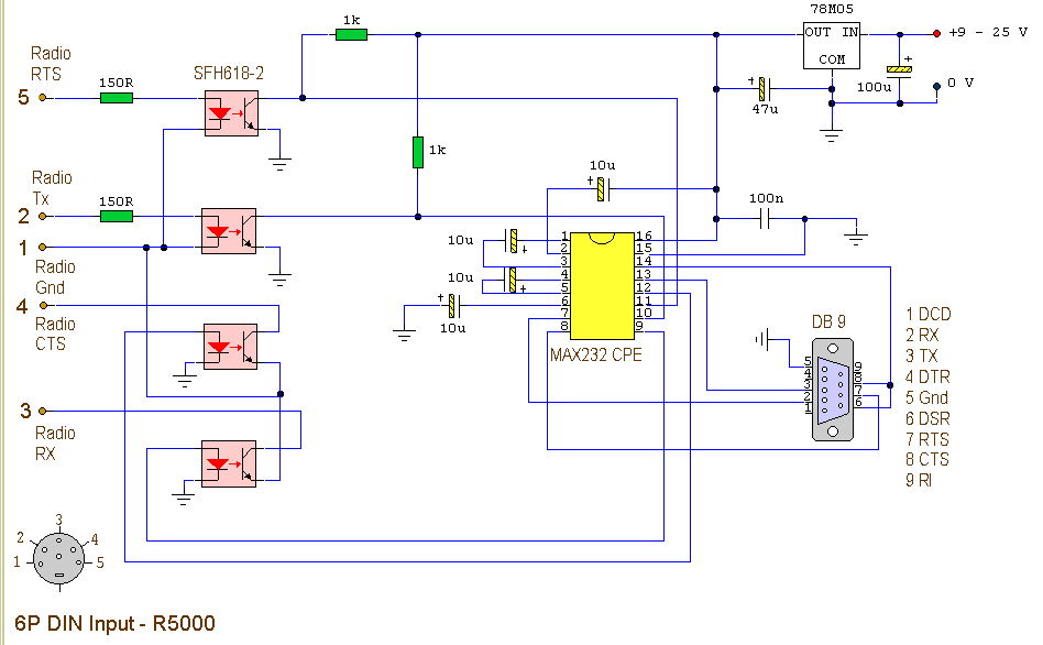 This circuit is a modified version of an original interface on QSL Net. It is a fully isolated interface allowing computer control of the Trio/Kenwood R5000 receiver. Separate software is needed to control the receiver.