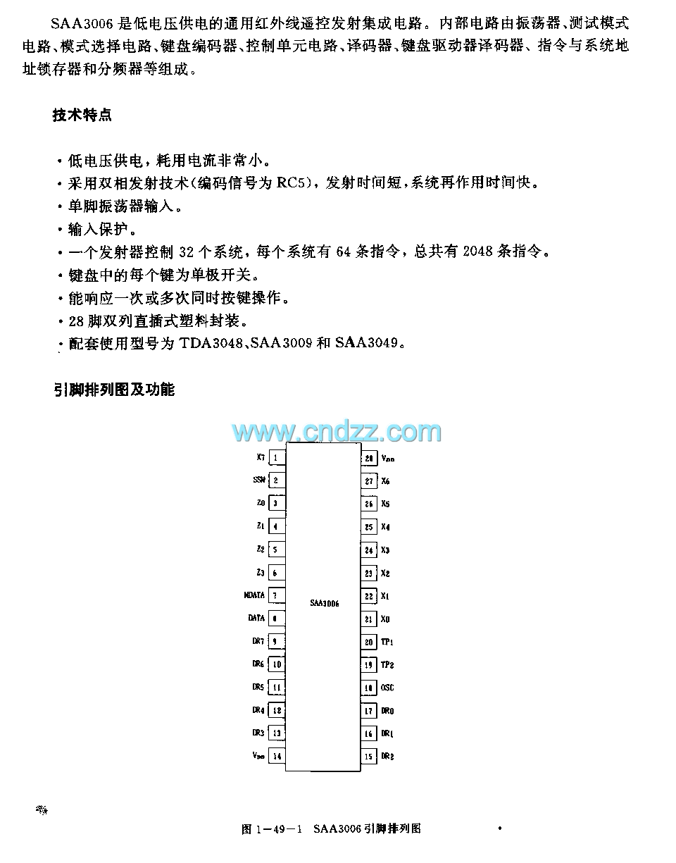 Low voltage power supply, the power consumption is very small,It uses the dual-phase launch technology, the launch time is short,The single pin oscillator input,the input protection,Every launcher controls 32 systems, every system has 64 instructions,Every button of the keyboard is the single-pole switch,28-pin dual-row DIP plastic package,The matching model are TDA3048, SAA3009 and SAA3049.