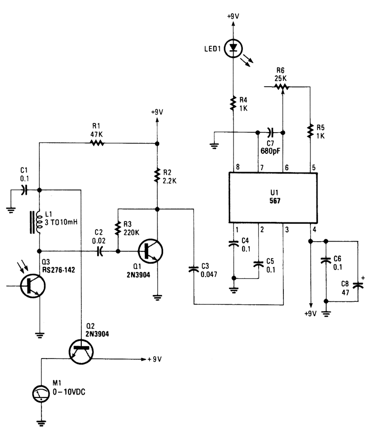 Phototransistor Q3 acts as a sensor that detects modulated IR energy. Q1 is an amplifier and U1 is a tone decoder. LED1 lights on reception of an IR signal with proper tone modulation.
