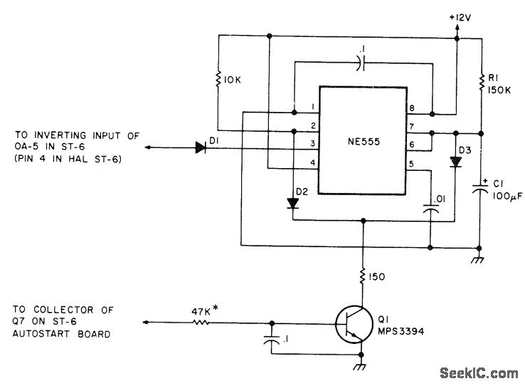 Uses 555 timer IC to make ST-6 autostart turn off motor of teleprinter if copying commercial station that does not drop its carrier when no text is being trans. mitted. Values shown for C1 and R1 give time of 15 s which, added to 25 s of ST-6 delay, gives about 40 s to turn off in presence of steady mark tone (carrier only). Useful when copying weather and press reports.-R. Bourgeois, Stop That Autostart, 73 Magazine, May 1977, p 47.