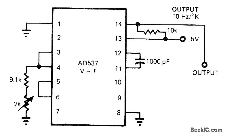 Temperature sensor on chip of AD537 voltage-to-frequency converter IC minimizes number of external parts needed. Output frequency changes 10 Hz for each degree (kelvin or Celsius) change in temperature.-J. Williams, De-signer's Guide to: Temperature Measurement, EDNMagazine, May 20, 1977, p 71-77.