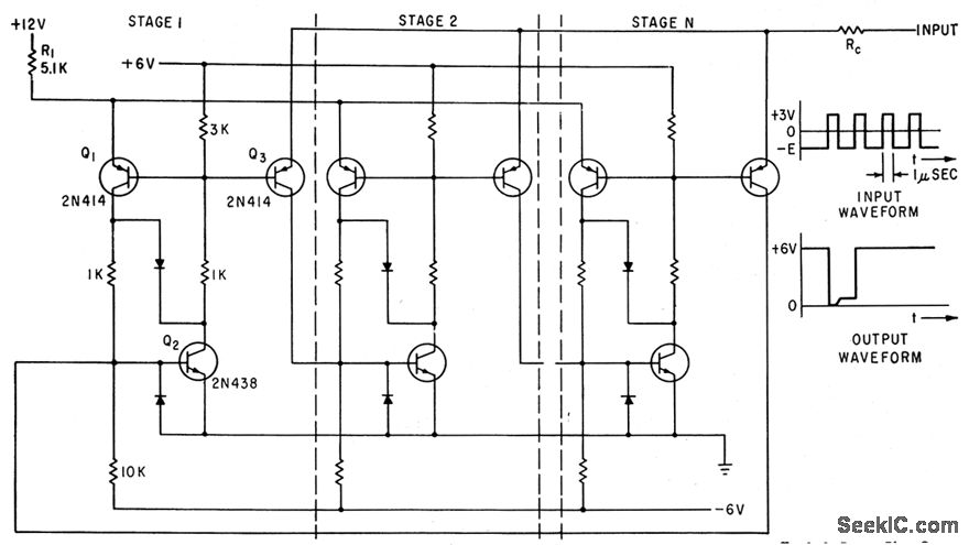 Each bistable circuit has two opposite-symmetry germanium transistors, two diodes, and four resistors. Additional transistor Q transfers conducting stage to next position when actuated by transfer pulse. Absence of capacitors gives high-speed operation. No bias current is required from ON stage to keep other stages cut off.-J. A. Pecar, Ring Counter Uses Transistors, Electronics, 34:4, p 49-51.
