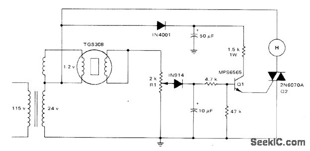 Conductivity of Taguchi TGS308 gas sensor increases in presence of combustible gases, increasing load voltage across R1 from normal 3 VRMS to as much as 20 V. Rise in voltage trips comparator to turn on transistor Q1 that supplies trigger current to 2N6070A sensitivegate triac. Resulting fullwave drive of Delta 1600316824-VAC horn gives sound output of 90 dB at 10 feet. Horn stops automatically when gas clears sensor.-A.Pshaenich, Solid State Gas/Smoke Detector Systems, Motorola, Phoenix, AZ, 1975, AN-735,p4.
