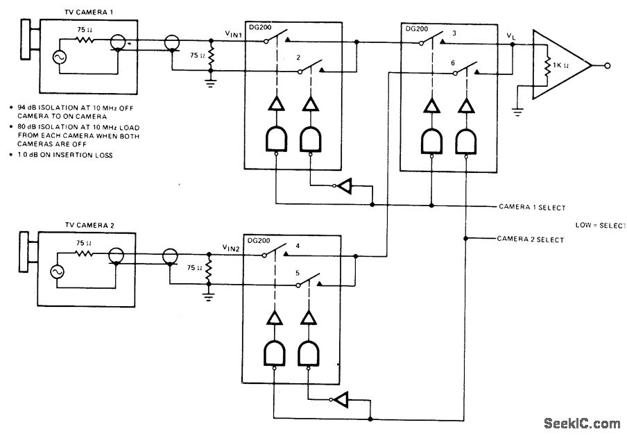 DG200 CMOS switches with built-in drivers provide 94-dB isolation at 10 MHz between on and off cameras. Desired camera is turned on by applying low logic level to select line for that camera.- Analog Switches and Their Applications, Siliconix, Santa Clara, CA, 1976, p 7-26.