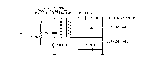 The circuit below is a DC to DC converter using a standard 12 VAC center tapped power transformer wired as a blocking oscillator. The circuit is not very efficient but will produce a high voltage usable for low power applications. The input battery voltage is raised by a factor of 10 across the transformer and further raised by a voltage tripler consisting of three capacitors and diodes connected to the high voltage side of the transformer. The circuit draws about 40 milliamps and should operate for about 200 hours on a couple of 'D' alkaline batteries. Higher voltages can be obtained by reducing the 4.7K bias resistor.