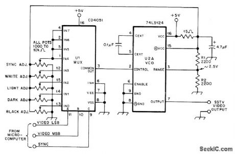Digital-to-analog-to -frequency converter for slowscan television permits direct generation of simple graphic and alphameric characters by microprocessor, without use of camera, U1 is CD4051 CMOS analog multiplexor, and U2A is one section of 74LS124 TTL dual voltage-controlled oscillator. Picture format uses 64 different lines, repeated once to give total of 128 lines, with maximum of 64 different picture elements per horizontal line each having one of four shades of gray. Separate pot is provided for setting each of five different levels so VCO oscillates at proper frequencies: sync-1200 Hz; black-1500 Hz; dark-1767 Hz; light-2033 Hz; white-2300 Hz. Article covers operation in detail and gives flow diagrams for microprocessor subroutines required.-B. Sanderson, SSTV Pictures from Your Microcomputer, QST, Oct. 1978, p 25-29. (View)