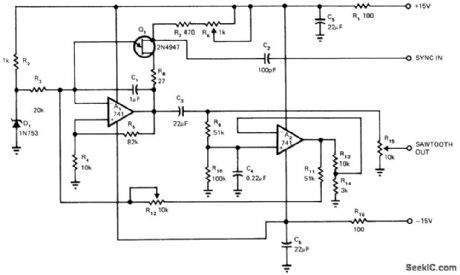Developed for 60-Hz vertical deflection in high-resolution video display requiring highly linear ramp summed with second integral of ramp to give S shaping of deflection so sweep is linear on flat screen. Opamp A1 is connected as integrator that takes integral of constant voltage across zener D1. Period of integration is limited by UJT Q1 that resets integrating capacitor C1 when negative-going sync signal is applied to base 2 of Q1. Sawtooth linearity can be trimmed by adjusting ratio of R.4 to R5. Sync range is wide enough so external vertical hold can be eliminated. Amount of shaping can be adjusted with pot.-L. G. Smeins, S -Shaped Sawtooth Oscillator, EDN Magazine, Feb. 20, 1974, p 83 and 85. (View)