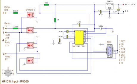 This circuit is a modified version of an original interface on QSL Net. It is a fully isolated interface allowing computer control of the Trio/Kenwood R5000 receiver. Separate software is needed to control the receiver. (View)