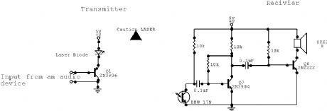This is a simple Laser communication system. It can transmit and receive signal from any audio device.Communication distance is few meters. All components are not critical. Transistor 2N2222 may be on the coolrib. Laser diode is from laser pointer.