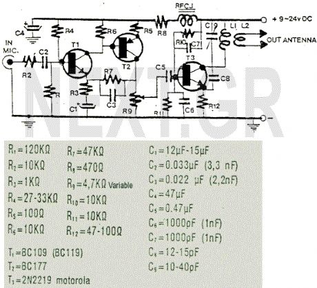This is a nice 2 Watts FM transmitter. It has a Super-Sensitive pre-amplification with BC109 and BC177 with more than 100% signal modulation. The job finish the 2N2219 by Motorola. For the Coils you should use 1mm wire(enameled), L1= 3 turns - 10mm diameter, L2= 1 turn - 10mm diameter. R9 trimmer controls the modulation gain. The tunning is easy by controlling C9 trimmer (88-108 MHz). The RFC J should be the VK220J with ferrite (VK200 is not suitable).