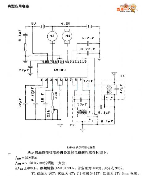 The telecontrol receiving decoding circuit's performance index shown as the chart are as follow: f radio frequency =27MHz, f audio frequency =5.5KHz, 100% modulation - square-wave; f radio frequency=±600Hz, and the frequency shift keying (FSK) is 160Hz, and the dutyfactor is 100%, 60% or 30%, T1's primary is 10T, secondary is 4T; T2's primary is 12T, secondary is 2T; the frame is 5mm.