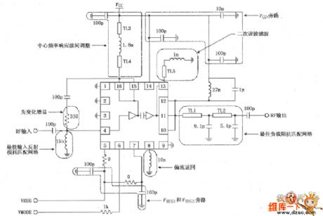 The diagram is USA CDMA application circuit composed of RF2162. Radio-frequency signal (RF) isinput by pin 4, enlarged by preamplifier, final power amplifier, then output by pin 10, 11, 12. Pin 4 is directly coupling with inside amplifier, so itsuggests to add an UHF blocking coupling capacitor.Pin 13 is used as thesecond harmonics filter circuit, and it uses transmission line or inductanceandchip capacitor to make up filter with resonance at 2f0, it can offer low impedance path to second harmonics and short-circuit second harmonics effectively. Pin 14 is used as the final power amplifier power supply end, which offers bias current. Pin 5 connects to thefirst step enable voltage VREG1, when this pin is low level, the circuit shuts off; when it is inhigh level ( 2.8V),all circuit worksin thestandard state, and pin 5is connectedto 100pF high frequency filter capacitor. Pin 6 connects toanalog bias control pin VMODE, when pin 6 is 0V, itoffers theminimum bias.