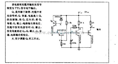 This circuit turns theoptical signal transmitted by optical cable to TTL signal level output.