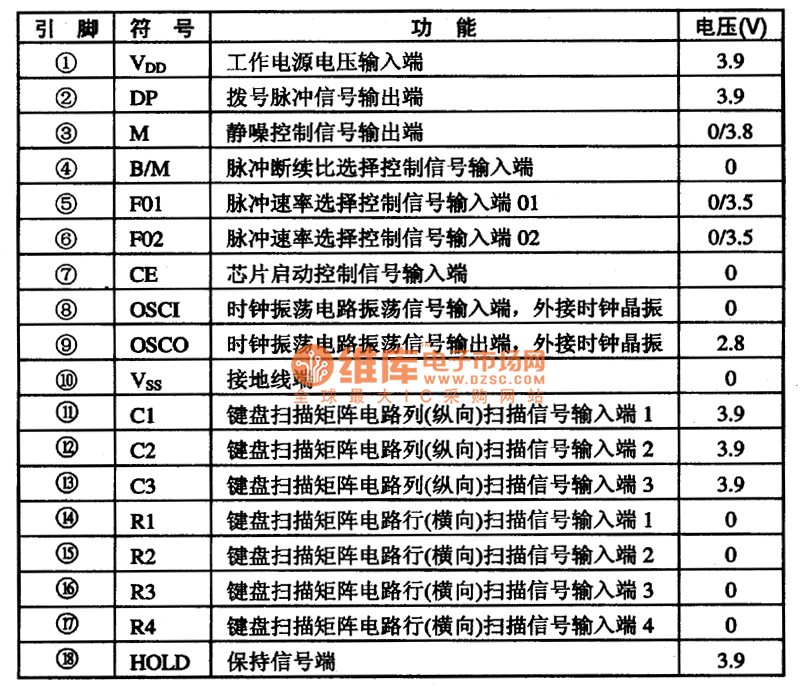 PCD3321P is a micro-computer dial-up circuit produced by Philips of the Netherlands. It is suitable for communications equipment dial-up. PCD3321P integrated circuit includes pulse dialing generation circuit, keyboard switches, squelch such encoding and decoding circuits. The IC uses 18 pins dual in-line package, the integrated circuit pin functions and data are listed in Table 1.