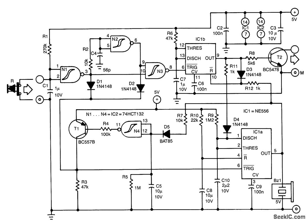 The circuit around T1 and N4 ensures that IC1A can accept trigger pulses again 10 s after the mono time of IC1B has lapsed. This arrangement prevents, for example, children operating the reset switch.