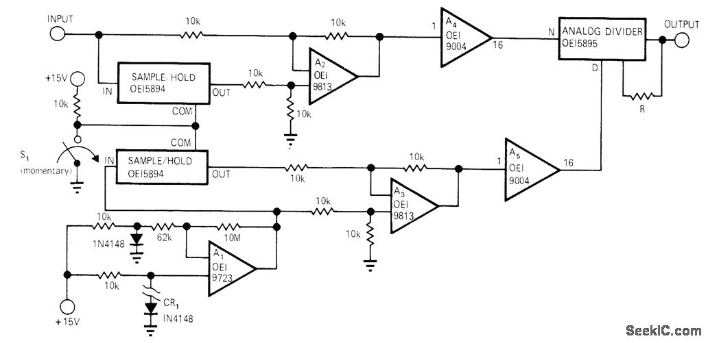 Circuit automatically measures and calculates temperature coefficients of analog circuits or devices. Silicon diode CR1 is used as temperature probe having forward drop of about 2 mV/ ℃. R adjusts output scale factor, FET-input opamp A1 converts forward voltage drop of temperature probe into high-level analog voltage that varies 325 mV/℃ from -10V at +55℃ to 10 V at -5℃. Output of A1 is applied to sample-and-hold circuit, while analog voltage from device under test is applied to second sample-and-hold. Momentary closing of S1 causes volt-age and temperature data to be stored in sample-and-hold circuits at start of test to bias a2 and A3. Outputs of these opamps can be positive or negative, butare made poshive by unity-gain absolute-value opamps A4 and A5. From these outputs, analog divider calculates temperature coefficient.-R. C. Gerdes, Temperature-Coefficient Measuring Circuit, EDN/EEE Magazine, Feb. 1, 1972, p 54.