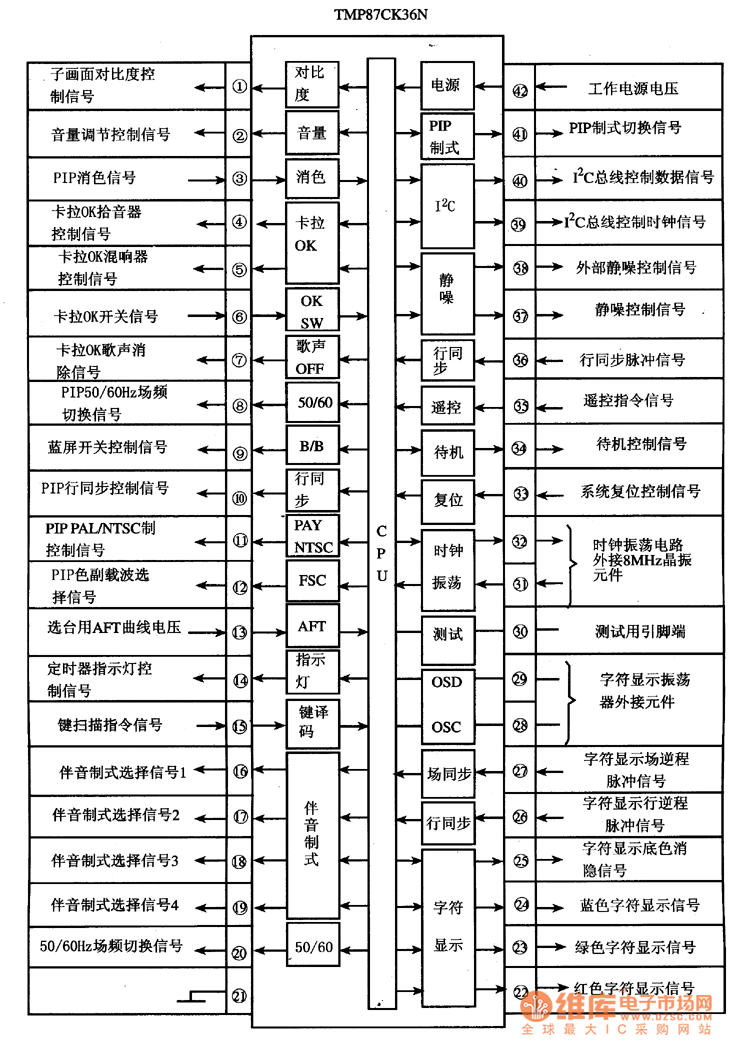 TMP87CK36N is the single-chip microcomputer integrated circuit produced by Toshiba, it is widely used in Changhong, Toshiba series of movement and assembly of large-screen color TV. 1. Features of functionsTMP87CK36N integrated circuits is mainly composed of the central processing (CPU), clock oscillator circuit, the reset control circuit, I2C bus control circuit, remote control command signals processing circuit, the character generation and processing circuit, standby / on control circuit, keyboard scan decoding circuit, squelch control circuit, audio format conversion circuit, and other control and auxiliary functions circuit, its block diagram is shown in Figure 1.Figure 1 shows the circuit block diagram and pin functions and signal flowing of TMP87CK36N integrated.2. Pin functions and data TMP87CK36N integrated circuit uses the package with 42 feet in double rows, the pin functions and signal flowing are shown in Figure 1, the pin letter code and data are listed in Table 1.