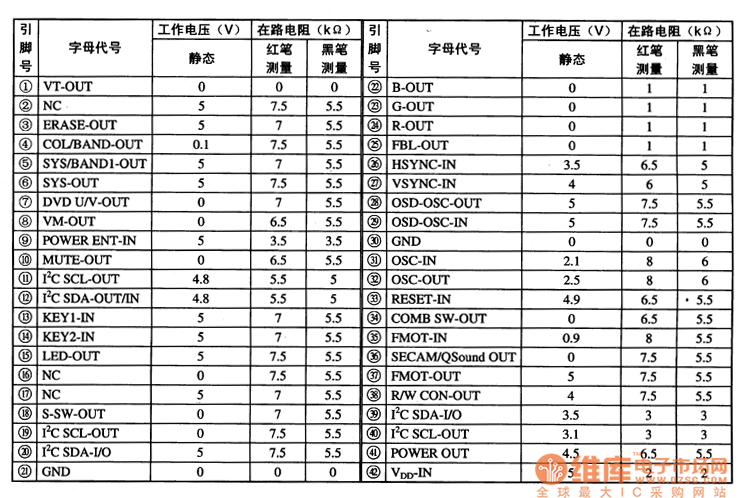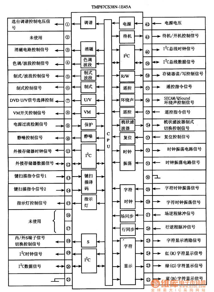 TMP87CS38N is single-chip microcomputer integrated circuit produced by Toshiba, it is widely used in Hisense, TCL, and other series of large-screen color TV. 1. Features of functionTMP87CS38N integrated circuits is mainly composed of central processing (CPU), reset control end, clock oscillation circuit, key bit instruction decoding circuit, I2C bus control circuit, memory control circuit, degaussing control circuit, remote control command signal processing circuit , screen display character generator and processing circuit, standby / on control circuit and other control and ancillary functions circuit. The block diagram of the circuit is shown in Figure 1. Figure 1 shows the block diagram and pin functions and signal flowing of TMP87CS38N integrated circuit 2. Pin functions and data TMP87CS38N integrated circuit uses the package with 42 feet in double rows, the pin and the signal flowing is shown in Figure 1, the pin code and the letters data are listed in Table 1. Table 1 shows the pins letter and data of TMP87CS38N integrated circuit.