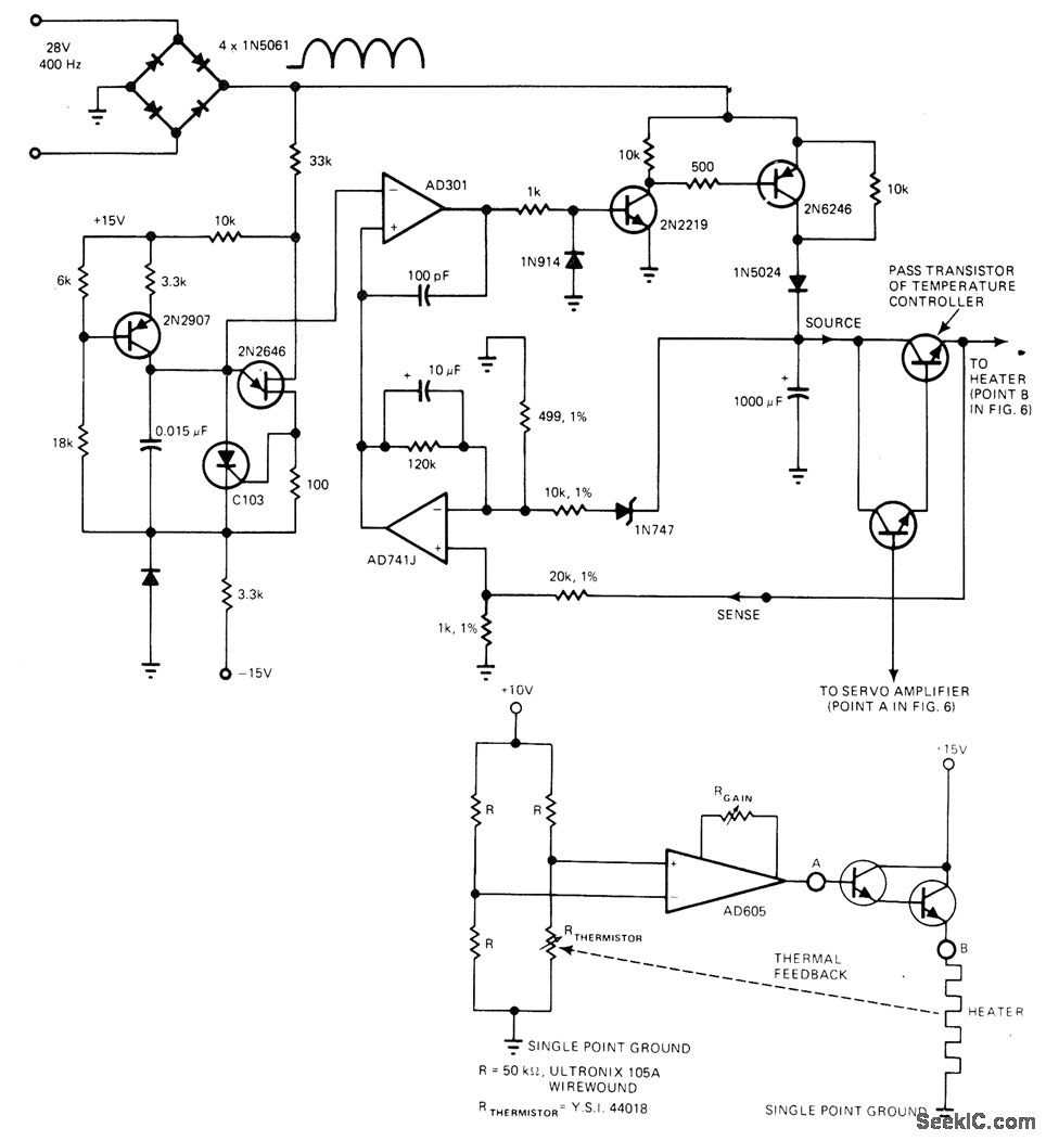 Will hold oven or bath at 37.5 ℃ with high stability. Bridge offset is sensed by AD605 instrumentation opamp having high common-mode rejection, low drift, and balanced inputs. Opamp drives Darlington pair providing current gain to heater. Pass transistor must dissipate all power not delivered to heater; to overcome this, large servo circuit is connected between points A and B to maintain constant 3 V across pass transistor regardless of heater power demands. Output of 741 opamp is compared with 400-Hz line-synchronized ramp by AD301A amplifier serving as pulse-width modulator that drives 2N2219-2N6246 transistor switch. Switch delivers phase-con-trolled power to 100-μF integrating capacitor and pass transistor of temperature controller.-J. Williams, Designer's Guide to: Temperature Control, EDNMagazine, June 20, 1977, p 87-95.