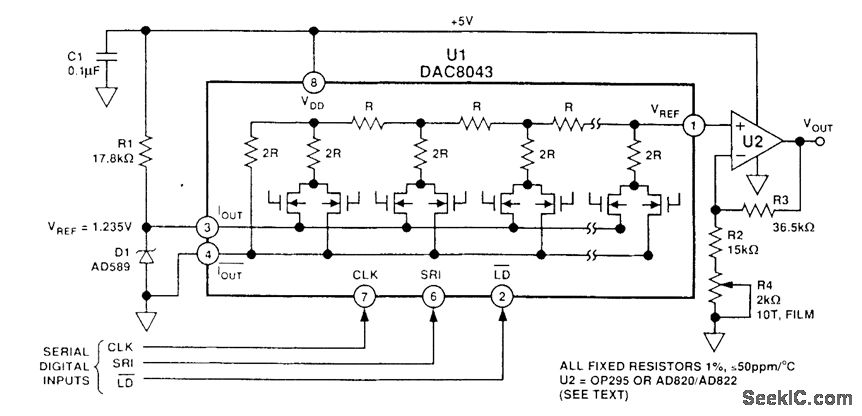 This circuit uses an Analog Devices DAC-8043 12-bit multiplying DAC The output will be D/4096×Vref where D is the numerical value of the digital input word(0 to 4095) Vref is 1.235 volts in this cicuit