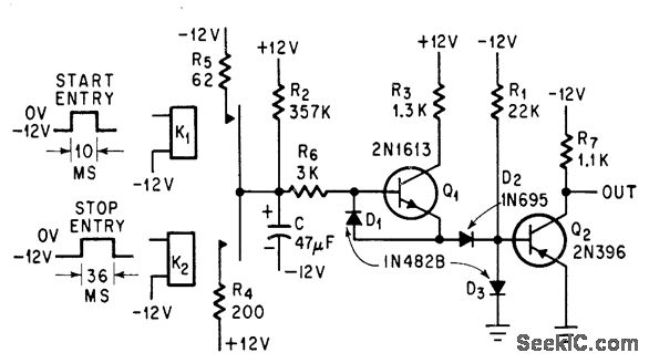 Two silicon transistors start timing action when 10-millisec start pulse closes reed relay K1, making output transistor Q1 conductive for 13 sec. Timing period can be shortened by applying 36-millisec pulse to K2.-H. W. Hines and L. C. Radzik, Electronic Timer Provides Long Delay, Electronics, 37:17, p 63.