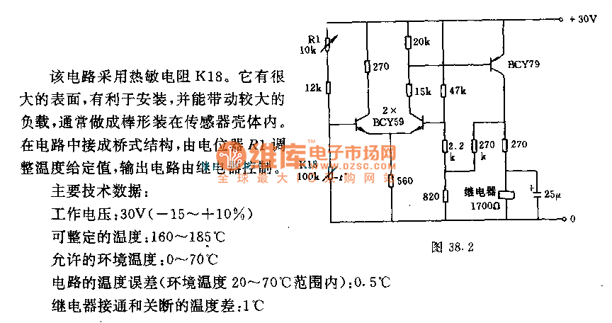 This circuit adopts thermal resistor K18. It has large surface and it is propitious to fix, it also can drive large load, it is always made into clavate and fixed in sensor housing. It is connected into bridge structure, and the temperature given value is adjusted by potentiometer R1, the output circuit is controlled by relay.