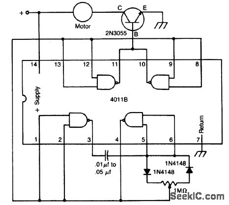 The circuit uses a 4011 CM0S NAND gate, a pair of diodes and an NPN power transistor to provide a variable duty-cycle dc source. Adjusting the speed control varies the average voltage applied to the motor. The peak voltage, however, is not changed. This pulse power is effective at very low speeds, constantly kicking the motor along. At higher speeds, the motor behaves in a nearly normal manner.