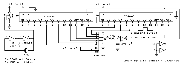At 1 Mhz, the 330K resistor in the oscillator circuit will need to be reduced proportionally to about 15K. When the terminal count is reached, a 7 uS reset pulse is generated by the Schmitt Trigger inverter stage that follows the NAND gate. The 47K resistor and 470 picofarad capacitor sustain the output so that the counters are reliably reset to zero. This is less than one clock cycle at 50Khz and does not introduce an error but would amount to 7 cycles at 1 MHz which would cause the counters to lose 7 microseconds of time per second. It's not much of an error (7 parts in a million) but it would be there. The minimum reset pulse width for the 4040 CMOS counters is about 1.5 uS, so the reset pulse cannot be made much shorter.