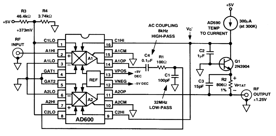 The AD600 dual voltage-controlled amplifier In this circuit provides a 3-MHz AGC system with80-dB range.