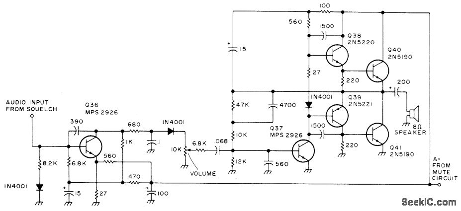 Used in all-band double-conversion super heterodyne receiver for AM, narrow-band FM, CW, and SSB operation. When only noise is present, first audio transistor Q36 is biased out of conduction by squelch and mutes loudspeaker. Supply is 13.6 V regulated. Article gives all circuits of receiver-D. M. Eisenberg, Build This All-Band VHF Receiver, 73 Magazine, Jan, 1975, p 105-112.