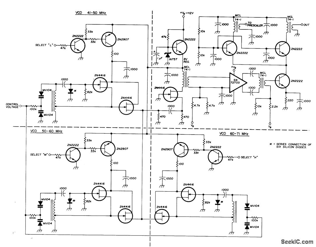 Three Indopendent low-noise VCOs are usedin 41-71 MHz frequency synthesizer, Control voltage is obtained from phase-comparator output of synthesizer. Outputs are chosen by selector switch.Texas Instruments SN72733 wideband amplifier is used for decoupling. Cascade arrangement provides two independent outputs at low impedance.-U. L. Rohde, Modem Design of Frequency Synthesizers, Ham Radio, July 1976, p 10-23.