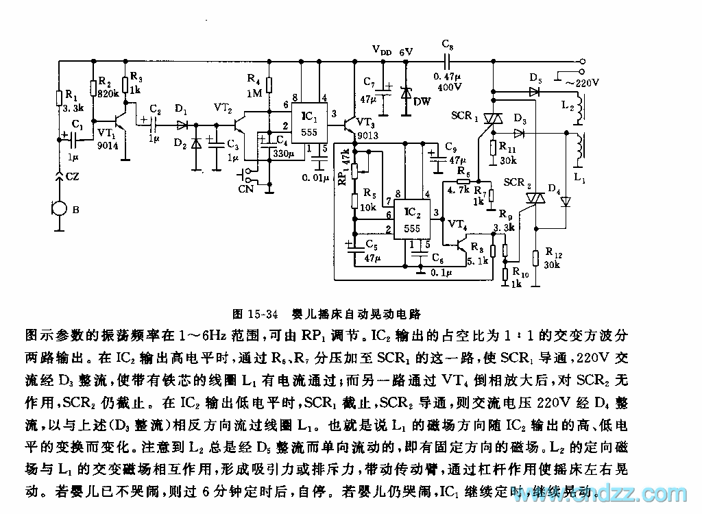 As the figure 15-34 shows, the circuit is composed of the pickup, the timer, the oscillator and the drive device, it can be used to automaticly shake the bed when the baby is crying.