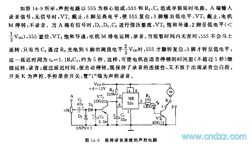 As the figure 14-9 shows, the sound control circuit uses the 555 as the core, the monostable delay circuit is composed of the 555 and R2, C3. The recording signal gets into the circuit from port A, when there is no signal, VT1 cuts off, pin-6 has the high electrical level to reset 555, pin-3 outputs the low electrical level, VT2 cuts off, the motor M stops working, the circuit will not tape. When port A has the signal, the signal is amplified and rectified by D1, D2 and C2, the VT1 conducts, pin-2 has the low electrical level, 555 sets, VT2 conducts, the motor M starts working, the circuit will start taping. When there is no recording signal in a short time, the 555 will not reverse immediately, only when the C3 is charged to the 2/3VDD of pin-6 through R2, the 555 resets, pin-3 has the low electrical level, the delay time td=1.1R2C3, it is about 5 seconds.
