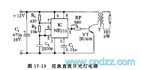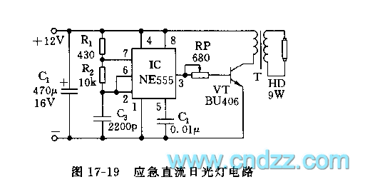 As the figure 17-19 shows, the astable multivibrator is composed of the 555 and R1,R2,C2, the oscillation frequency f=1.44/(R1+2R2)C2. The parameters of the figure have the high frequency oscillation frequency of 70kHz. The high-frequency square wave signal from the pin-3 is limited, then it adds to the VT tube, after the process of boost, this signal drives the light to turn on.
