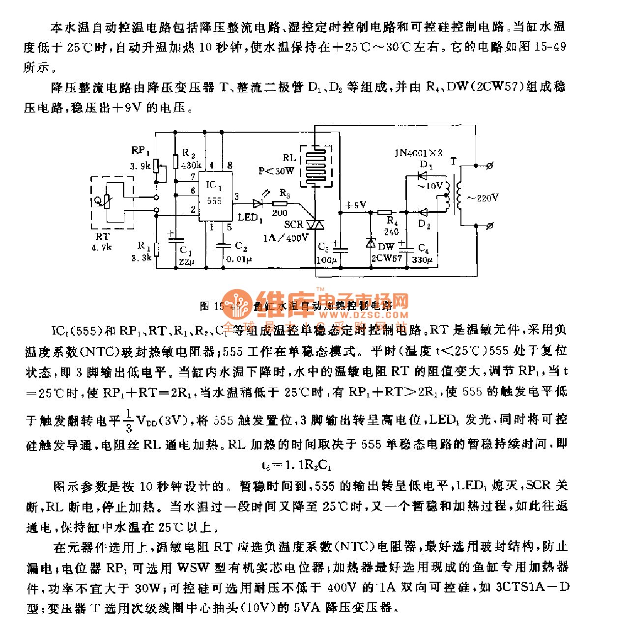 This fish tank water temperature automatic heating control circuit is composed of the step-down rectifier circuit, the humidity control timing circuit and the silicon-controlled rectifier control circuit. When the fish tank water temperature is lower than 25℃, the circuit automaticly heats for 10 seconds to keep the water temperature in the range of +25℃ to +30℃. The circuit is as shown in figure 15-49.