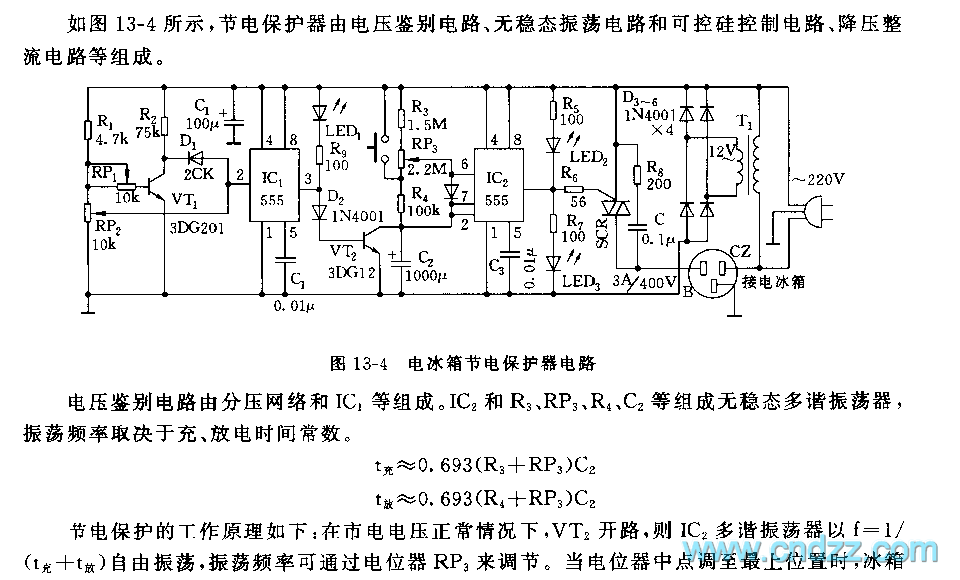As the figure 13-4 shows, the electricity saving protector is composed of the voltage identification circuit, the astable oscillator circuit and the SCR control circuit, the step-down rectifier circuit.