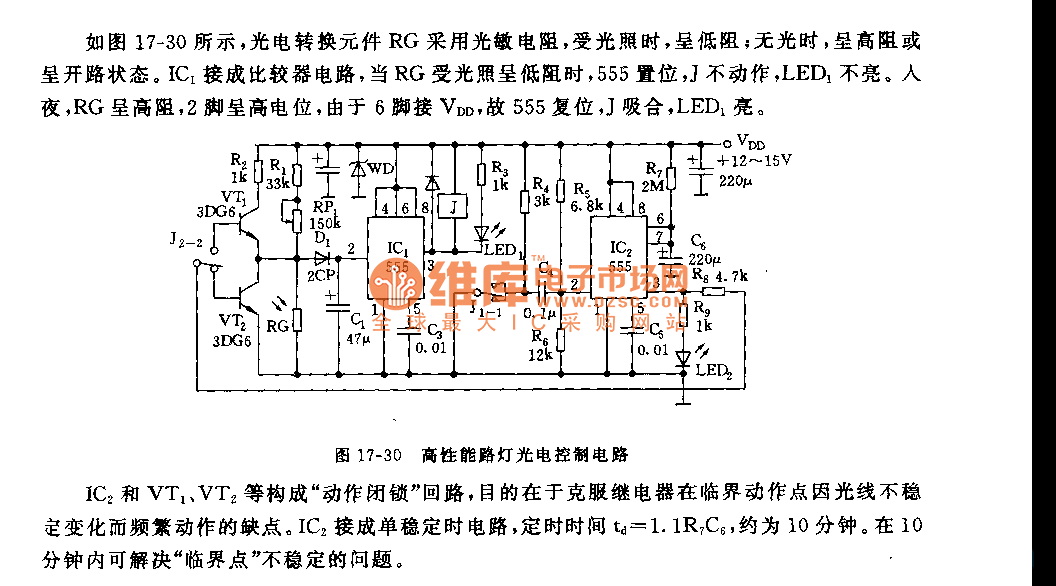 As the figure 17-30 shows, the photoelectric conversion element RG uses the photoresistor, when there is the light, it has the low resistance; when there is no light, it has the high resistance or in the open state. IC1 is the comparator circuit, when RG is lighted and has the low resistance, 555 sets, Jwillnotact, LED1 turns off. At night, RG has the high resistance, pin-2 has the high electric potential, because pin-6 connects with VDD, so 555 resets, J closes and LED1 turns on.