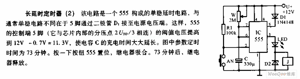 The difference between this monostable delay circuit which is composed of the 555 and the normal monostable delay circuit is the pin-5 of this circuit is connected with the power supply voltage port through the diode D1. So the 555's control port pin-5's (it is connected with the circuit's internal voltage division point 2UDD/3) threshold voltage is improved to 12V-0.7V=11.3V, this makes the charging time of the capacitance C to be extended greatly. The timing time of the figure parameters is 73 minutes. If you press the button, the 555 sets, the relay closes. After 73 minutes, the relay releases.