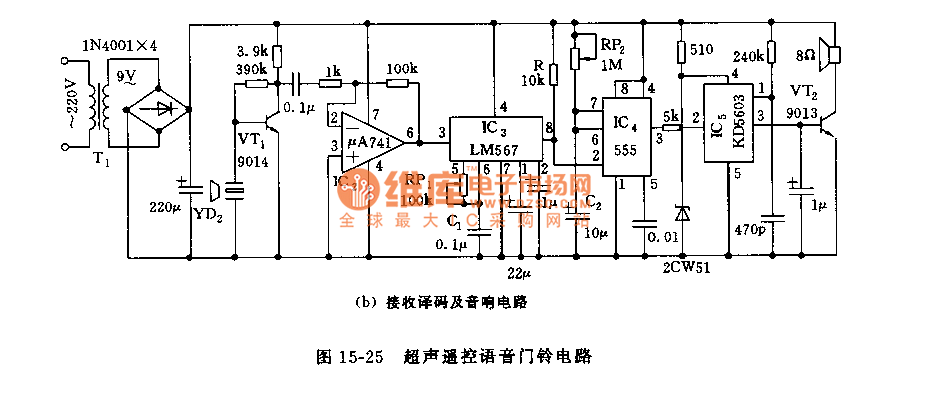 As the figure 15-25 shows, the doorbell is composed of the ultrasound launch circuit and the receiving decoding and audio circuit. This circuit can remote control the voice circuit at the distance of 10 meters.