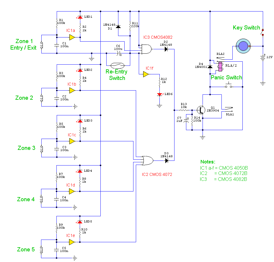 Circuit NotesEach zone uses a normally closed contact. These can be micro switches or standard alarm contacts (usually reed switches). Suitable switches can be bought from alarm shops and concealed in door frames, or window ledges.Zone 1 is a timed zone which must be used as the entry and exit point of the building. Zones 2 - 5 are immediate zones, which will trigger the alarm with no delay. Some RF immunity is provided for long wiring runs by the input capacitors, C1-C5. C7 and R14 also form a transient suppressor. The key switch acts as the Set/Unset and Reset switch. For good security this should be the metal type with a key.OperationAt switch on, C6 will charge via R11, this acts as the exit delay and is set to around 30 seconds. This can be altered by varying either C6 or R11. Once the timing period has elapsed, LED6 will light, meaning the system is armed. LED6 may be mounted externally (at the bell box for example) and provides visual indication that the system has set. Once set any contact that opens will trigger the alarm, including Zone 1. To prevent triggering the alarm on entry to the building, the concealed re-entry switch must be operated. This will discharge C6 and start the entry timer. The re-entry switch could be a concealed reed switch, located anywhere in a door frame, but invisible to the eye. The panic switch, when pressed, will trigger the alarm when set. Relay contacts RLA1 provide the latch, RLA2 operate the siren or buzzer.