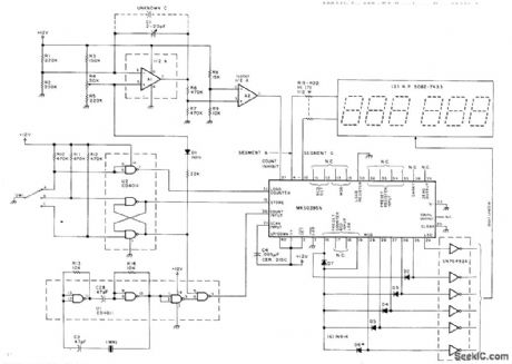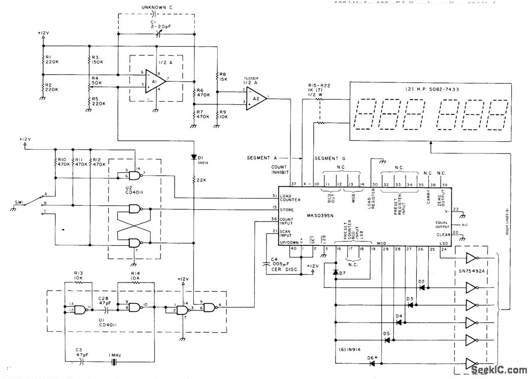 Digital capacitance meter provides display of capacitance values from 1 pF to 999999 pF (1.0μF). Start-measurement switch drains charge from capacitor under measurement and diverts constant-current source to ground. Capacitor begins charging,and counter accumulates 1-μs pulses from crystal clock. When capacitor charge voltage reaches threshold of countinhibit line for counter, contents of counter are displayed as capacitance value. Circuit uses Mostek MK50395N six-decade counter that provides ;-segment output data for display. Position A of SW1 is starting point B stores data in counter display after capacitor measurement, and C initiates measurement. Display includes leading-zero suppression.-J. Garrett,What's Your μF?, 73 Magazine, Dec. 1978, p 234-235.