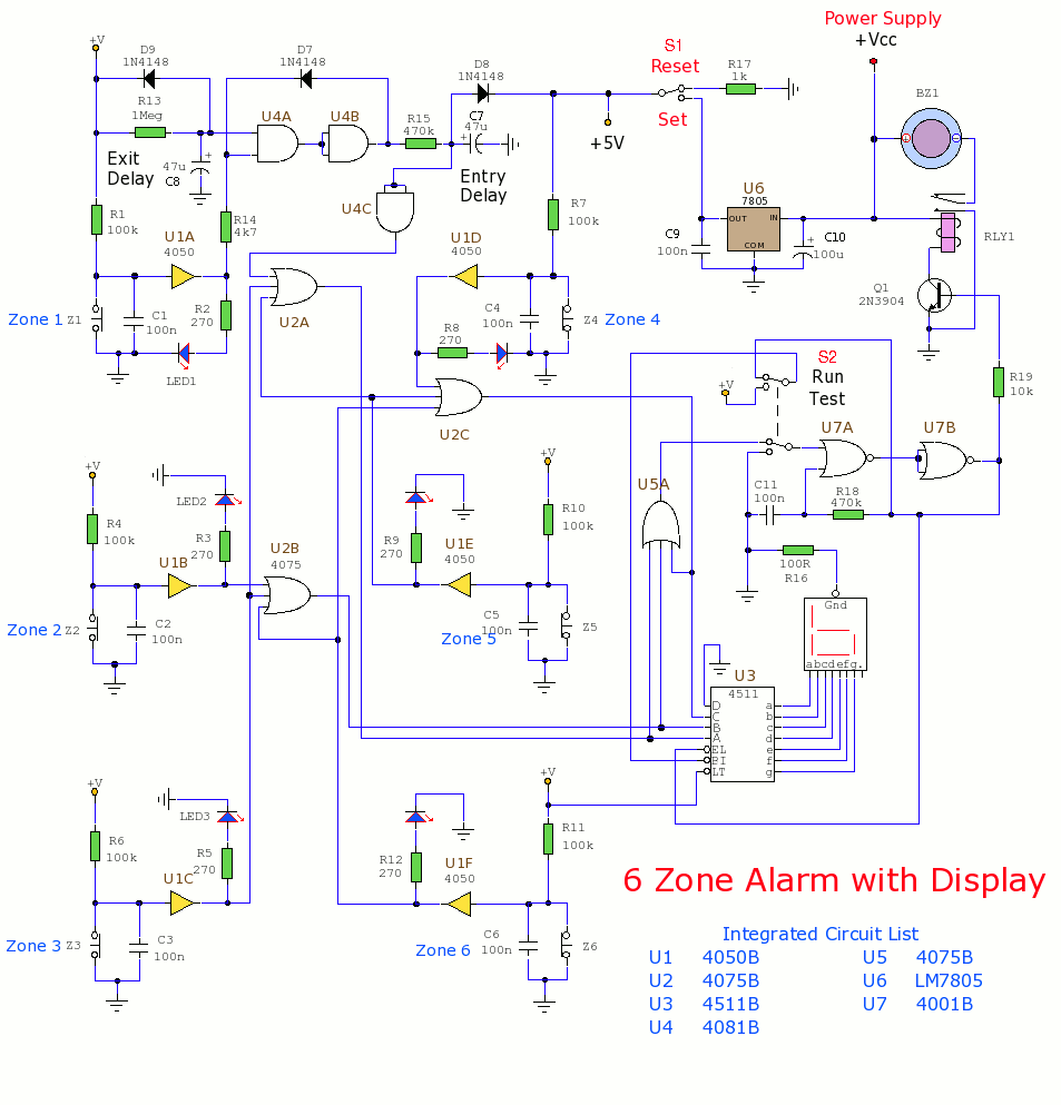 This alarm system has 6 independent zones, 1 timed entry/exit zone, a 7 segment LED display and a test or walkthrough facility. Suitable for a small office or home environment, it can also be adapted to use a combination lock or keypad to set and reset the alarm.