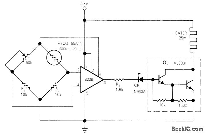 Provides propor-tional temperature control of small oven to within 1℃ over temperature range. Uses 823B voltage regulator operating from same 28-V source as oven. Temperature-setting pot should be 10-turn wirewound. Powertransistor Q1operates either saturated or almost cut off, so no heatsink is required.-R. L. Wilbur, Pro-portional Oven-Temperature Controller, EDNlEEEMagazine, Sept. 15, 1971, p 45.