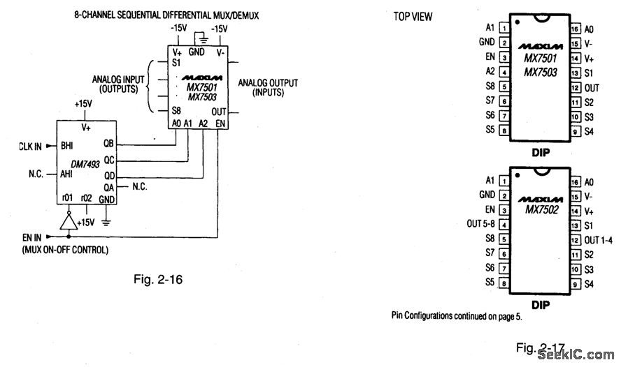 Figures 2-16 and 2-17 show a typical application circuit and pin configurations, respectively, for the MAX7501/02/03. In this circuit, the IC acts as a multiplexer or demultiplexer by inter-changing the analog inputs and outputs. Each channel is sampled in sequence by signals from a DM7493 under the control of an external clock. MAXIM HIGH-RELIABILITY DATA Book, 1993, P.1-47.