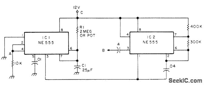 Developed for AM radio transceivers making use of repeaters, to limit length of individual transmission so as to avoid being timed out at repeater. Uses NE-555 connected as timer, with C1 and R1 chosen to set timing at about 90 s. Point A is connected to terminal of TB switch that goes from neutral or ground on receive to 12 V on transmit. Timing cycle begins on transmit; when IC1 times out, it activates IC2 connected as 1000-Hz astable oscillator driving transceiver connected to B. Tone sounds until microphone button is released to reset timer.-S. Kraman, Try the Mini-Timer, 73 Magazine, June 1977, p 48.