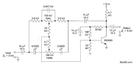 A single transistor used as a feedback amplifier is connected with ac feedback through the tone controls, which determine the frequency response of the stage.