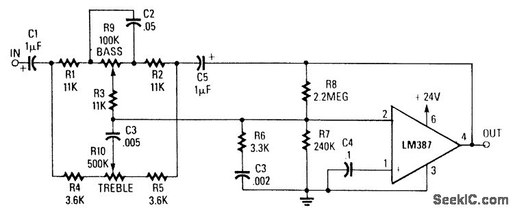 The use of a low noise LM387 in a feedback circuit provides 20-dB boost or rejection of treble and bass. The supply voltage is +24 V.