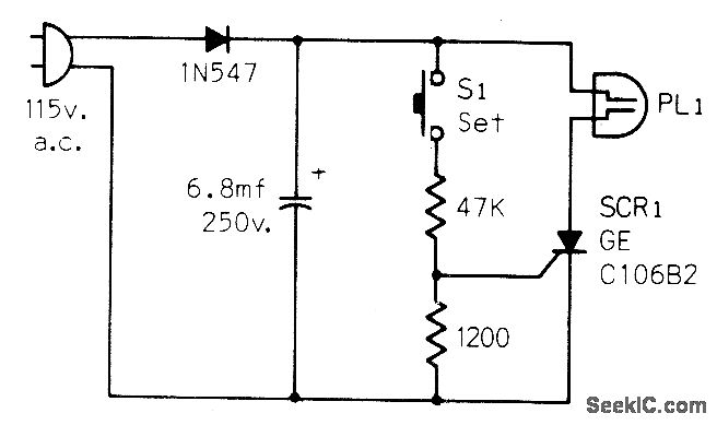 Detects AC line failures of any duration and turns off neon lamp PL1 to indicate that clocks require resetting. Circuit is plugged into AC outlet, and S1 is pushed to trigger SCR on and send current through lamp.-J. R. Nelson, Some Ideas for Monitoring A.C. Power Lines, CQ, July 1973, p 56.