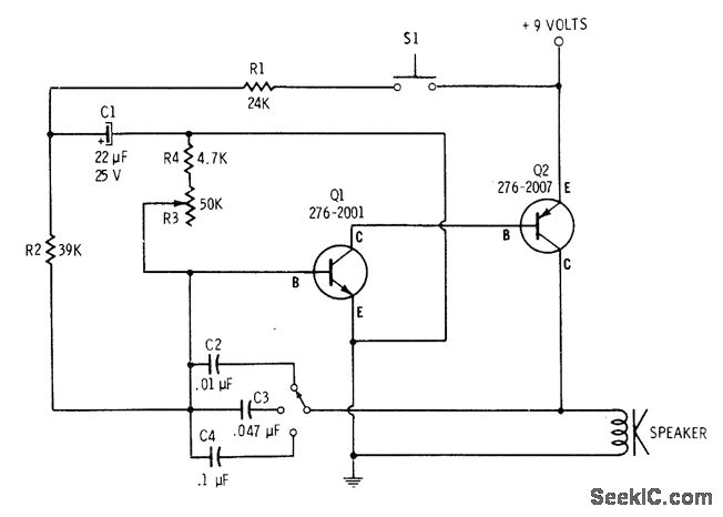 Tone is made adjustable by using multiposition switch to change capacitors in oscillator circuit. Speed (rate of change in frequency) of siren is adjusted with R3. 4700-ohm resistor in series with R3 keeps siren op-erational when R3 is rotated to minimum-resistance position. Siren is operated by pressing switch to produce rising wail, then releasing switch until wail drops down to cutoff.-F. M. Mims, Transistor Projects, Vol.1, Radio Shack, Fort Worth, TX, 1977, 2nd Ed., p 58-63.