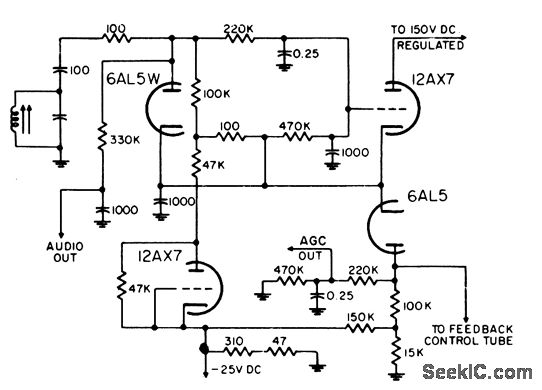 Uses d-c amplifier in agc circuit to keep output of communication receiver more nearly constant despite widely varying input signal. One drawback of amplified agc is that when d-c ampliler plate current drops, bias voltage at its cathode increases agc output and thereby reduces gain of controlled stages.-NBS, Handbook Preferred Circuits Navy Aeronautical Electronic Equipment, Vol. 1, Electron Tube Circuits, 1963, p N 12-4.